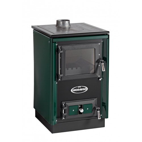 Kamna na pevná paliva KVS MORAVIA VSP 9114.7482 Sofie zelené v rustikálním stylu. Rozměrné topeniště umožňuje použiti polen do 350 mm a průměru do 230 mm.