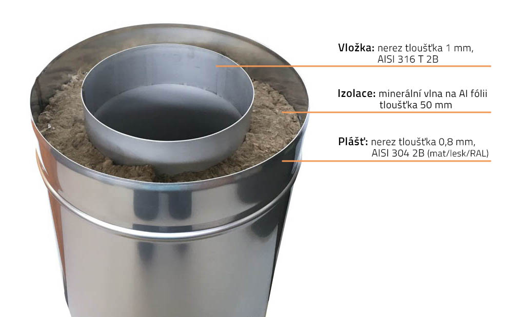 Tloušťka nerezové vložky je 1 mm, izolace 5 cm a plášť 0,8 mm.