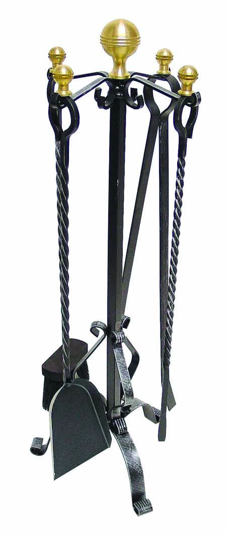4-dílná sestava krbového nářadí na stojánku z kované oceli a mosaznou ozdobou. Součástí je smetáček, lopatka, kleště a špice.