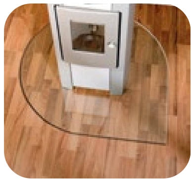 Sklo pod kamna,tvrzené čiré,odolné vůči vysokým zátěžím. Broušená fazeta na nášlapných hranách eliminuje možnost zakopnutí o hranu.