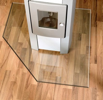Sklo pod kamna,tvrzené čiré,odolné vůči vysokým zátěžím. Broušená fazeta na nášlapných hranách eliminuje možnost zakopnutí o hranu.