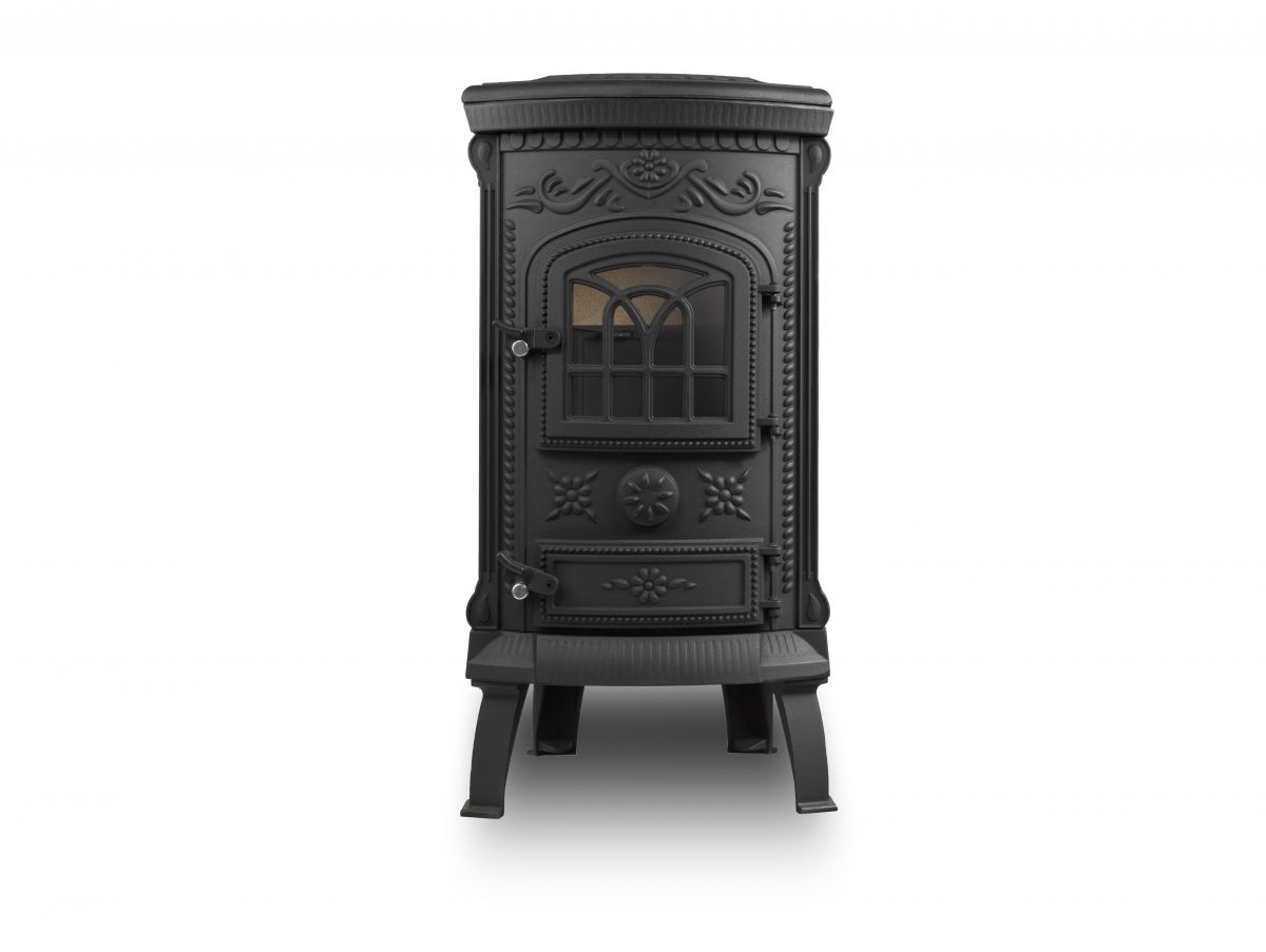 Menší litinová krbová kamna VERDO černé v tradičním designu – vzhled jako starožitná kamna litinová. Kamna mají celolitinové topeniště, litinový rošt, popelník pod roštem, systém čištění skla vzduchem, primární a sekundární regulátor.