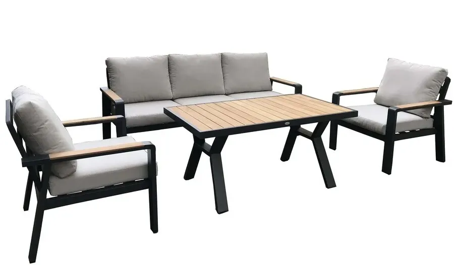 Luxusní hliníková souprava v grafitovém provedení, doplněna o teakové područky a desku stolu. Moderní souprava, která skvěle zapadne do každého exteriéru či interiéru.