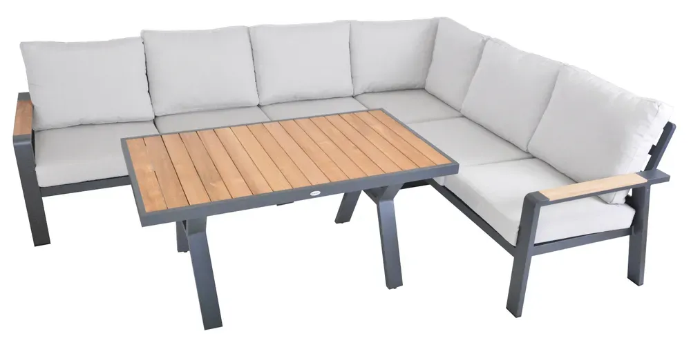 Luxusní hliníková souprava v grafitovém provedení, doplněna o teakové područky a desku stolu. Moderní souprava, která skvěle zapadne do každého exteriéru či interiéru.