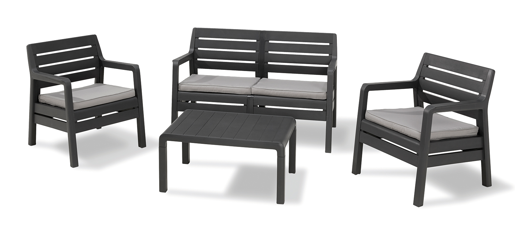 Zahradní set DELANO Graphite je nábytek vysoké kvality a moderního designu s texturou napodobující dřevěné panely. Sada zahrnuje lavici a dvě židle s područkami a poduškami a obdélníkový stůl. Ideální pro umístění na balkón, terasu nebo do zahrady. Montáž je velmi snadná a set nevyžaduje téměř žádnou údržbu. Vyznačuje se vysokou odolností vůči nepříznivým povětrnostním podmínkám a UV záření.